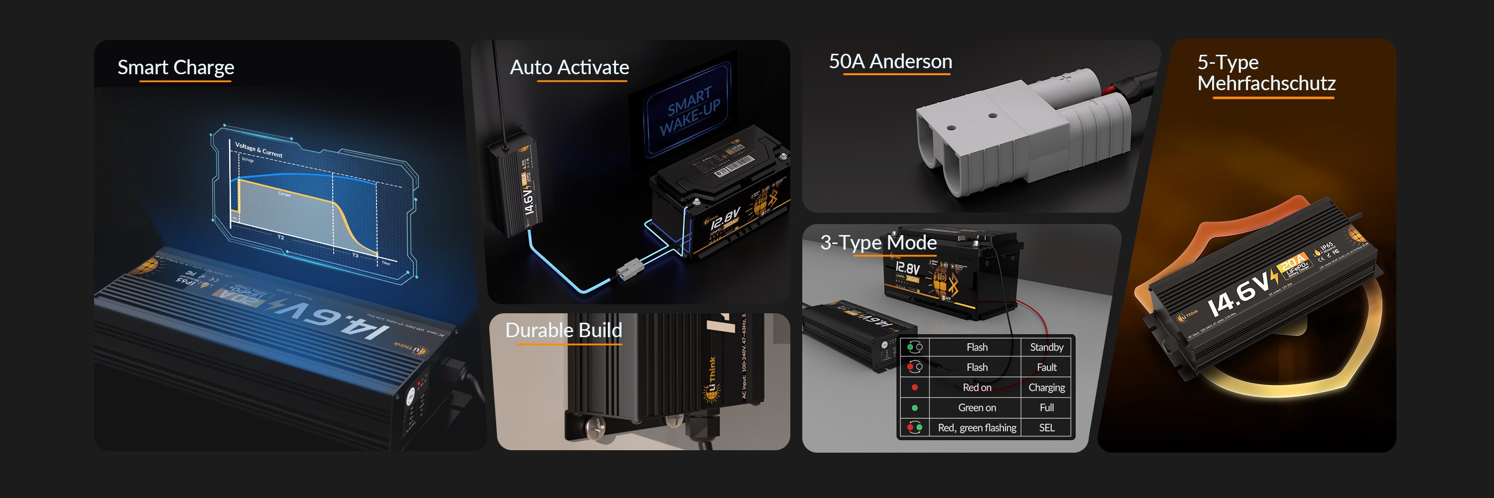 Dieses 20A-Ladegerät stellt doppelt so viel Strom bereit wie das 10A-Modell, wodurch sich die Ladezeiten deutlich verkürzen. Zum Beispiel benötigt man nur etwa 2,5 Stunden, um eine Lithink 12.8V 50Ah Batterie voll aufzuladen, und ungefähr 5 Stunden für eine 100Ah-Batterie. Eine größere Lithink 12.8V 150Ah Batterie wäre in rund 7,5 Stunden vollgeladen, eine 200Ah Batterie in circa 10 Stunden. Im Grunde kann das 20A-Ladegerät pro Stunde etwa 20Ah in die Batterie laden. Die tatsächlichen Ladezeiten können je nach Temperatur und den Abschaltparametern des Batterie-BMS geringfügig variieren, aber insgesamt ermöglicht das 14,6V 20A Ladegerät bei allen Kapazitäten eine deutlich schnellere Ladung der Lithink-Batterien.